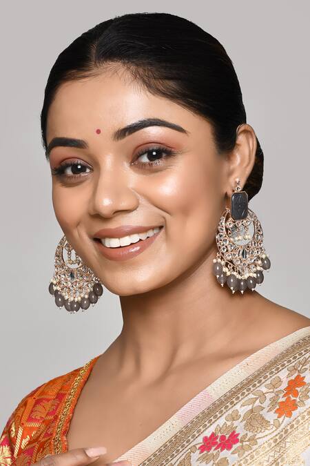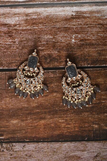 Gold toned chandbalis with grey bead embellished, floral carved top & kundan studded.