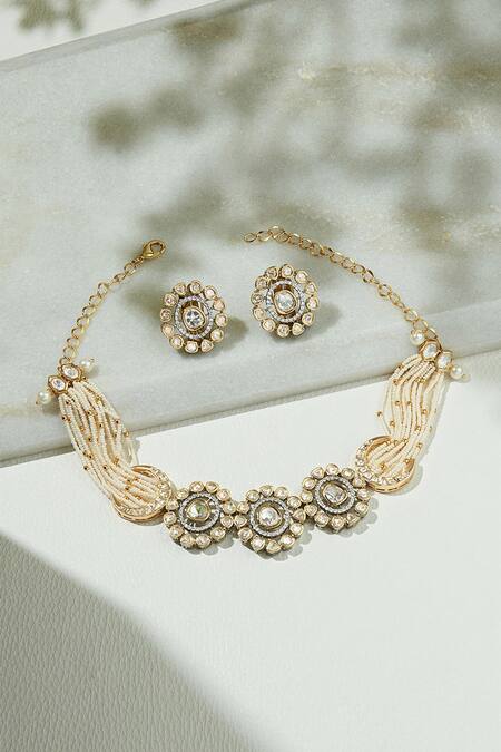 Gold finish choker necklace featuring multi-layered strands adorned with pearls, gold beads, and kundan polki embellished pendants. Paired with matching stud earrings for a complete set.