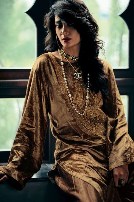 Taupe velvet kurta featuring a round neckline, bell sleeves, and sequin embroidered yoke with contrast threads. Paired with viscose gajji pants showcasing an all-over paisley print and a Moroccan print dupatta made of viscose mashru satin.