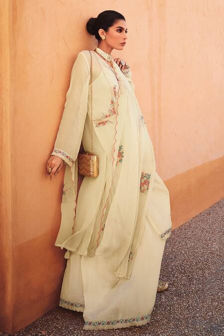 Off-white kurta featuring embroidered floral motifs highlighted with sequins. Paired with a sharara, inner, and dupatta embroidered with rosettes.