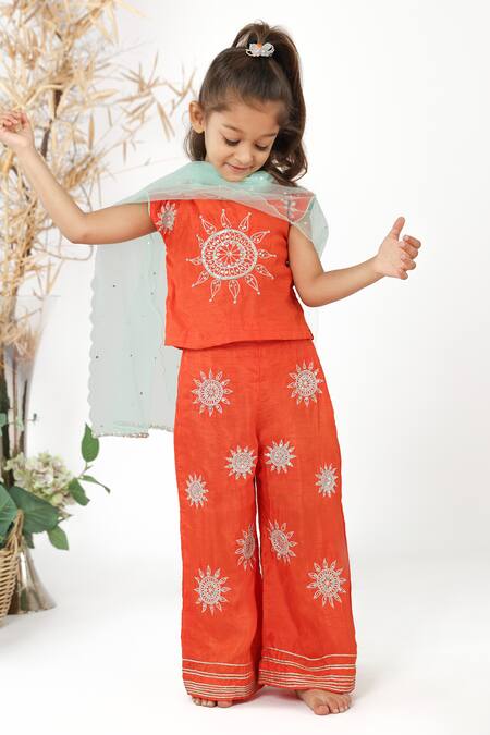 Orange Silk, Organza, Linen Zari, Sequins, Embroidery Sun Pant Set