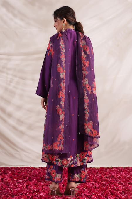 Purple silk kurta featuring multi-color floral print with sequin, bead, and French knot thread embroidery. Paired with printed palazzo and dupatta in mulberry silk.