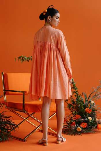 Peach Silk Cotton Solid High Neck Gathered Flare A-line Dress
