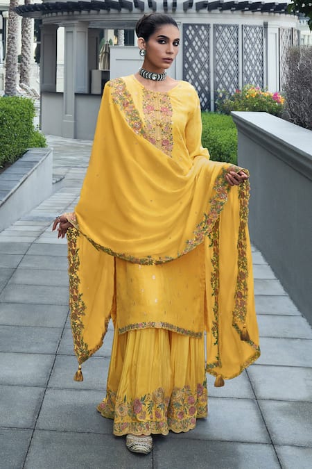 Yellow kurta featuring full sleeves, round neckline, and floral embroidered placket. Paired with matching pants and a dupatta adorned with floral embroidery and border details.