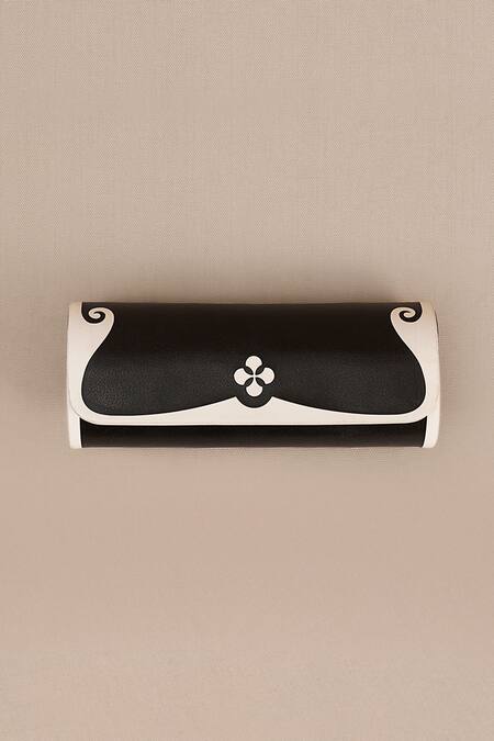 Black sunglass cover featuring white laser cut detailing on the front flap