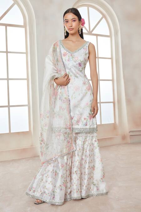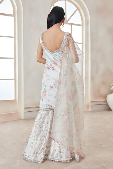 White silk kurta featuring floral prints and sequin embroidery. Paired with a matching gharara and a printed organza dupatta.