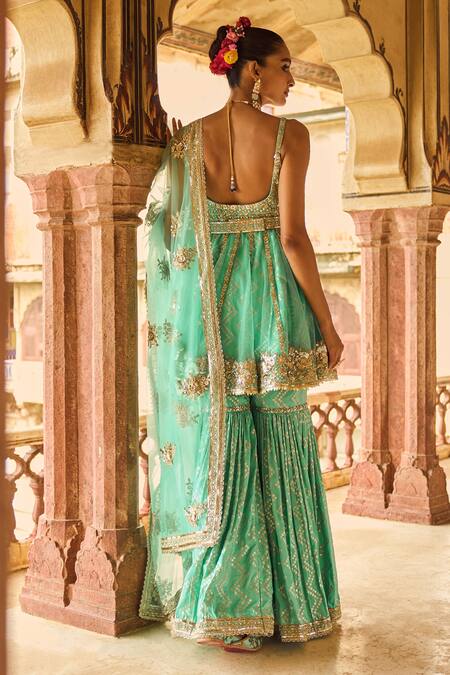 Green kurta featuring trellis embroidery on the bodice with stones, zari, and thread work. Paired with a chevron pattern gharara and an embroidered dupatta with sequins.