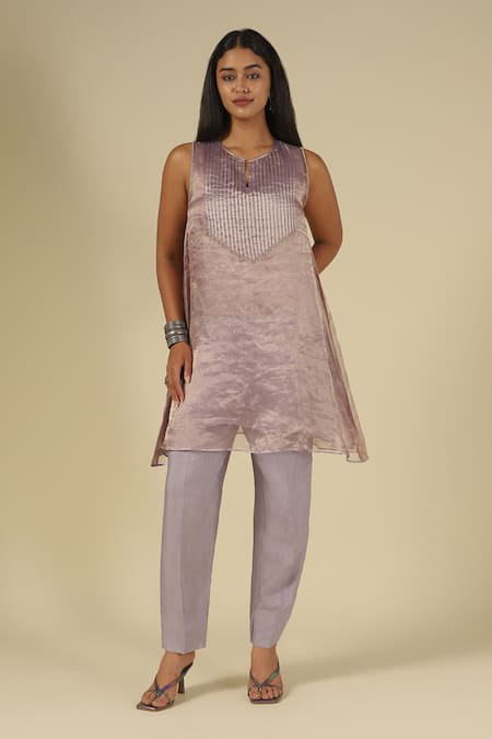 Dusty lilac kurta set featuring a tissue organza kurta with a textured embroidered yoke and delicate bead embellishment. A soft silk slip provides structure while tailored cotton-silk trousers complete the ensemble.