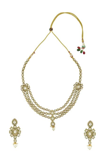 Gold plated layered choker featuring polki embellishments and a floral brooch. Paired with floral drop earrings adorned with pushback clasps.