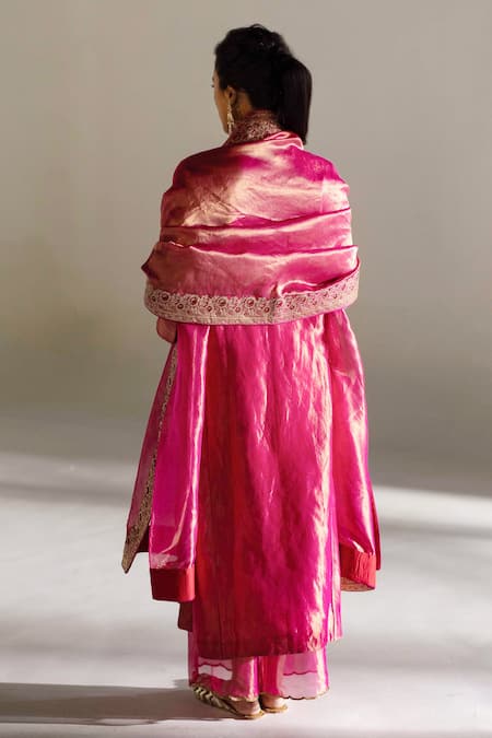 Magenta dupatta crafted in tissue silk featuring a woven floral motif border