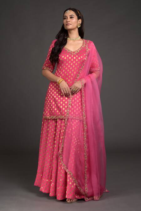 Raspberry pink lehenga with all-over gold woven motifs. Comes with short kurta and dupatta.