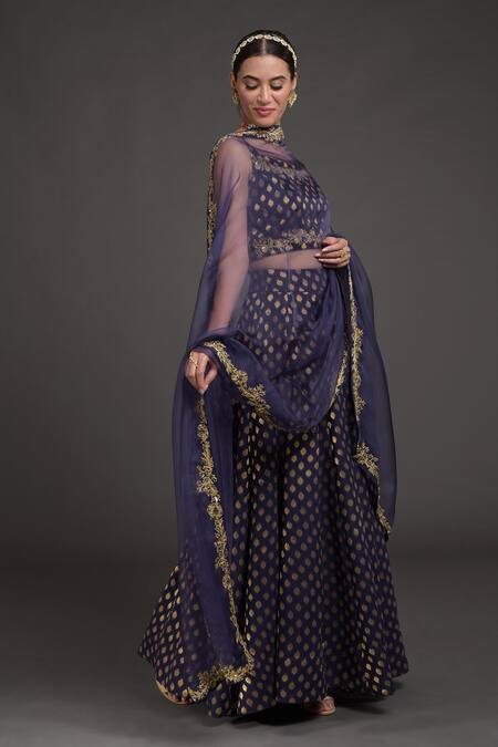 Eclipse blue lehenga with all-over gold woven motifs. Comes with half sleeves blouse and dupatta.