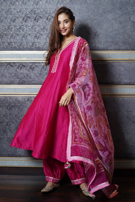 Buy_Leela By A_Pink Chanderi Geometric Print, Gota Patti, Mirror, Thread And Anarkali Salwar Set_Online_at_Aza_Fashions