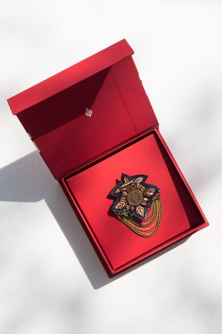 Navy dual-toned brooch featuring metallic chains and geometric blend patterns
