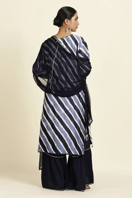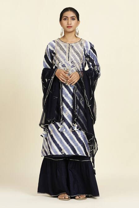 Blue leheriya dyed straight kurta featuring gota patti hand embroidery on the placket and scattered all-over. Paired with a sharara and chiffon dupatta with gota embroidered border.