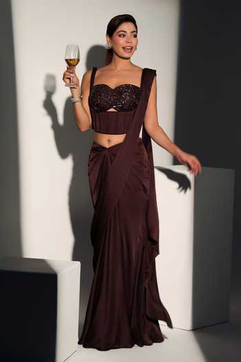 Brown Satin Embroidery Sweetheart Neck Diana Pre-draped Saree With Corset
