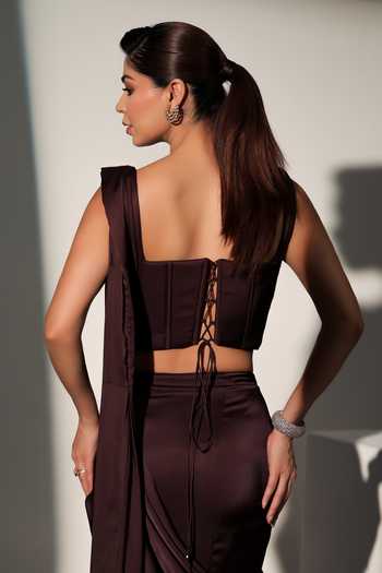 Brown Armani satin pre-draped saree with a boned sweetheart corset featuring monotone hand embroidery on the bust.