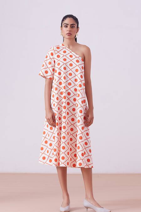 Cream one shoulder dress with orange geometric print, flared sleeve on side and in-seam pockets.
