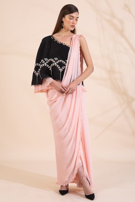 Exhibit effortless glamour in this exquisite dual-hued ensemble. Features a pre-draped baby pink saree, crafted out of luxe fabrics. Enhanced with an attached one-shoulder cape, decked with 3D florals , beads and pearls. This layered cape further flaunts of ruffle and cord detail hemline, enriched with loop trims on the neckline.