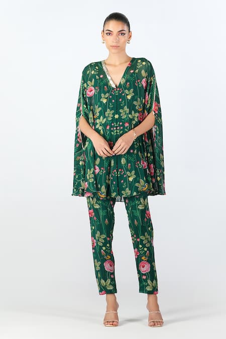 Buy_Limerick By Abirr N' Nanki_Green Georgette Printed Floral V Neck Renisa Tunic And Pant Set