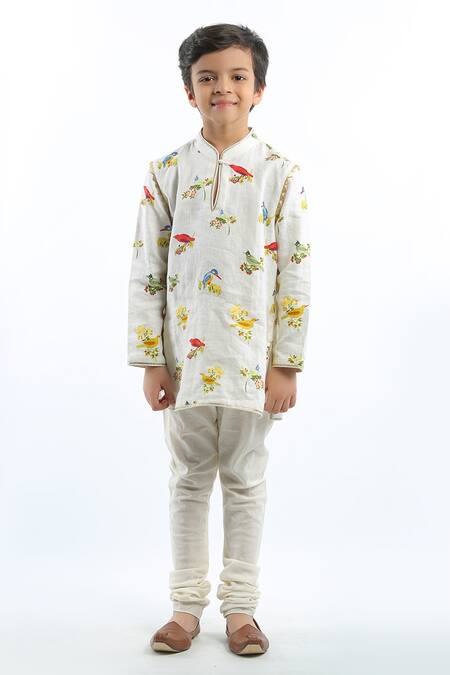 Ivory kurta featuring a vibrant bird print and a mandarin collar. Paired with a matching churidar for a complete look.