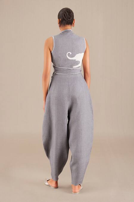Grey sleeveless top featuring front knot detailing and intricate elephant embroidery. Paired with relaxed fit pants with side pockets.
