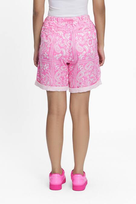 Pink paisley print shorts made in linen base with rolled up hem & circular ring detailing.