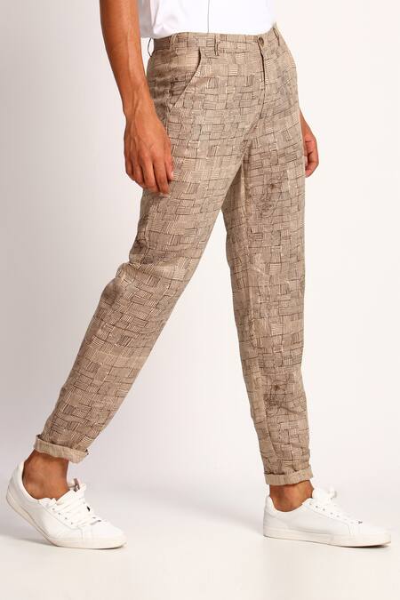 Beige linen trousers with all-over geometric motifs & placement doodle screen print.