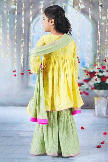 Yellow angrakha kurta featuring sequin floral embroidery and three-quarter sleeves. Paired with a green embroidered sharara, a contrast border dupatta, and a handmade potli with ghungroo tassel.