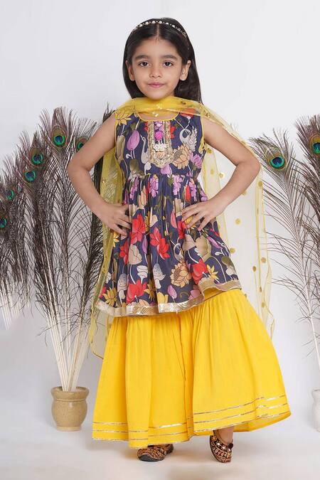 Purple cotton silk kurta featuring lotus and duck print with back button closure. Paired with yellow gota embroidered sharara and a matching dupatta.