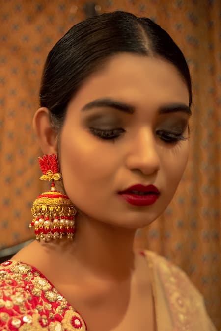 Red jhumkas featuring intricate hand embroidery with thread, dabka, and ghunghroo
