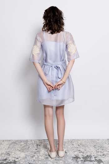 Powder blue shirt dress features intricate embroidery across the silhouette with a classic shirt collar and centre button-down front. Comes with a detachable waist tie and a soft cotton slip for comfort.