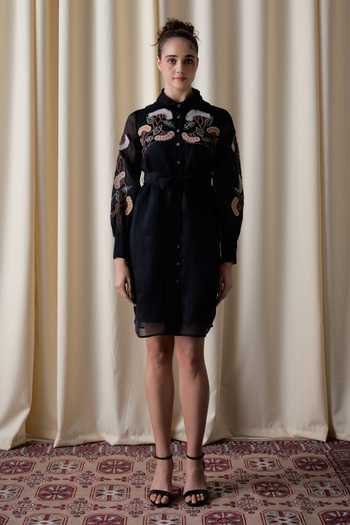 Black Silk Organza, Cotton Satin Collared Moonlight Grape Shirt Dress