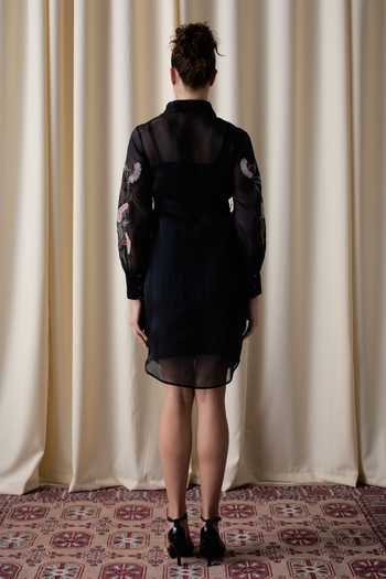 Black silk organza dress with sheer overlay, cinched tie-waist and billowing sleeves, featuring grape embroidery. Paired with a cotton satin slip.