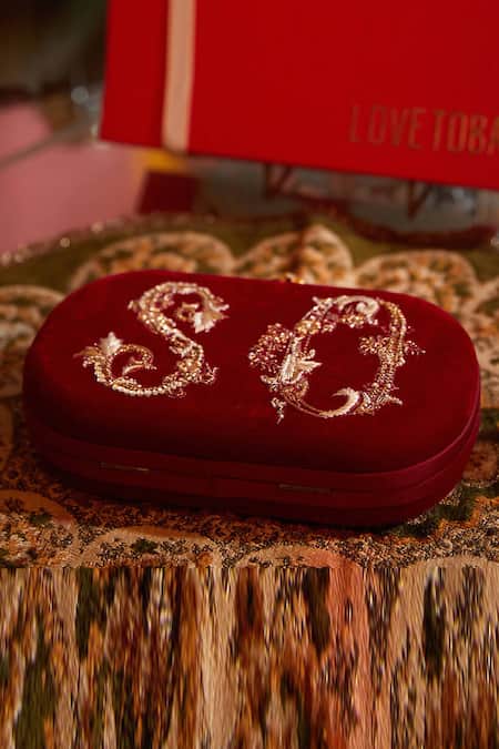 Ruby red oval clutch featuring hand embroidery with initials in zardozi, embellished with fine dabka, beads, and threads