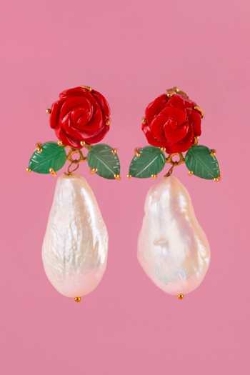 Handmade with rose carved stone, Nickel-free design, Pearl danglers with intricate detailing