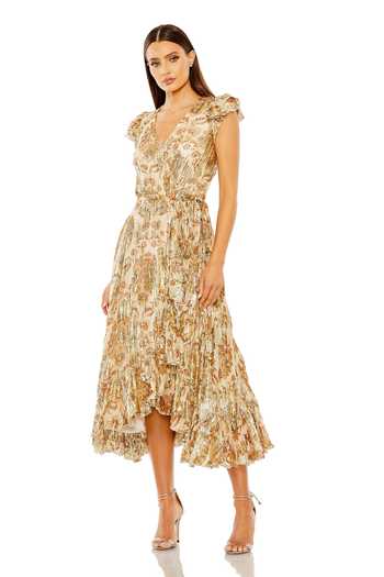 Cream and multi-colored midi dress featuring a floral print and a waterfall ruffled hem