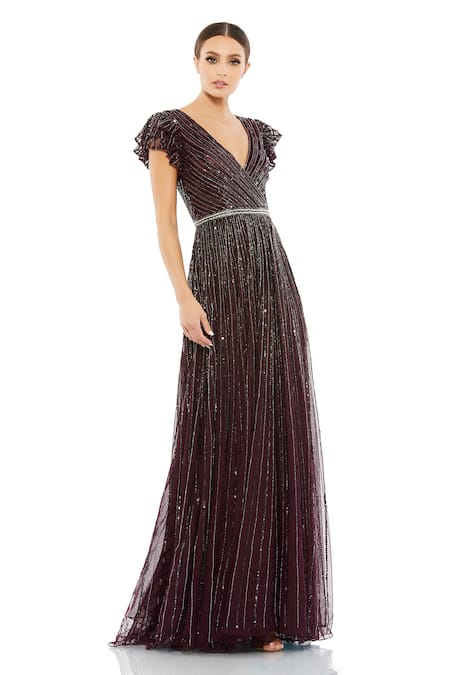 Purple gown featuring a V neck, ruffled sleeves, and a back zip closure