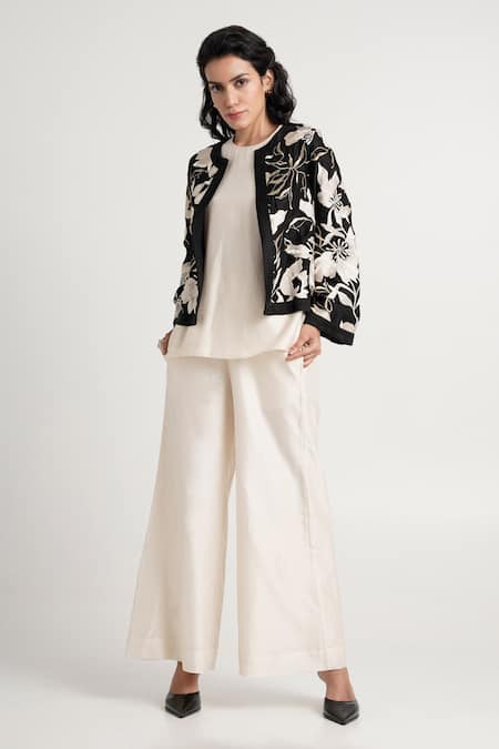 White Cotton, Silk, Chanderi Betty Twilight Monochrome Floral Jacket Pant Set