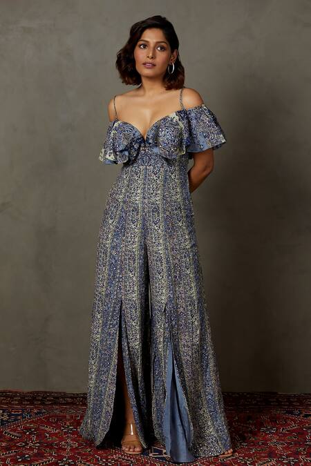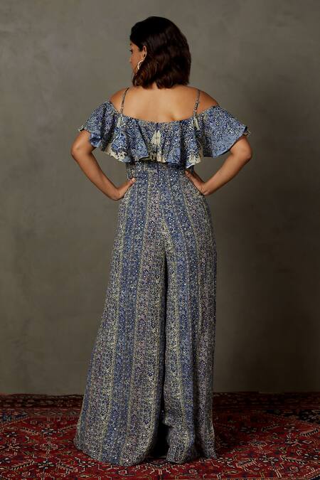 Blue jumpsuit featuring a sweetheart neckline and overlay sleeves with frill detailing