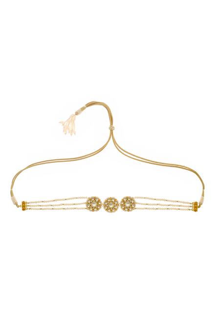 Gold pendant choker featuring bead and stone embellishments with a pull out drawchord closure. Dimensions are 9 inches in length and 1 inch in width, weighing 25 grams.
