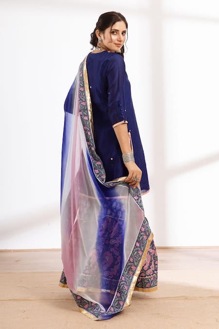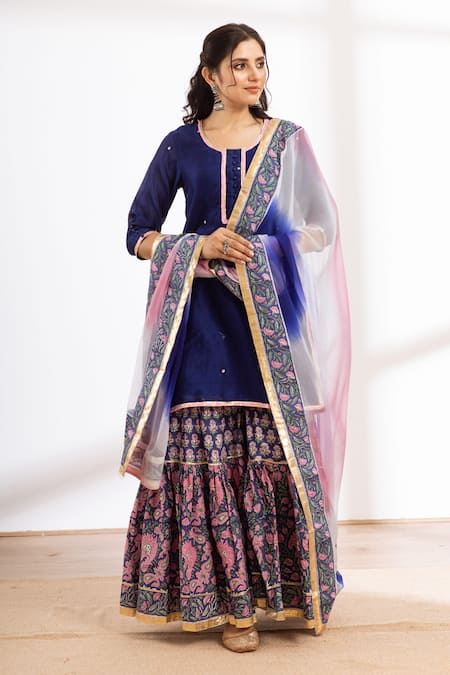 Blue hand block printed chanderi kurta featuring a round neckline and three-quarter sleeves. Paired with a cotton sharara and chiffon dupatta, both adorned with intricate detailing.