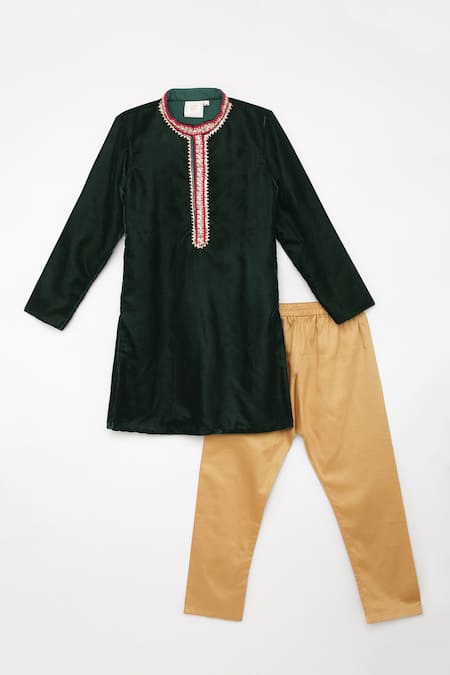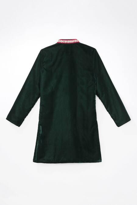 Buy_Byb Premium_Green Velvet, Cotton Satin Embroidery Mandarin Collar Kurta Set_at_Aza_Fashions