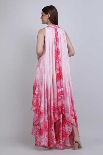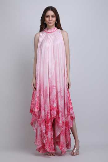 Pink Satin High Neck Blush Asymmetric Low Dress