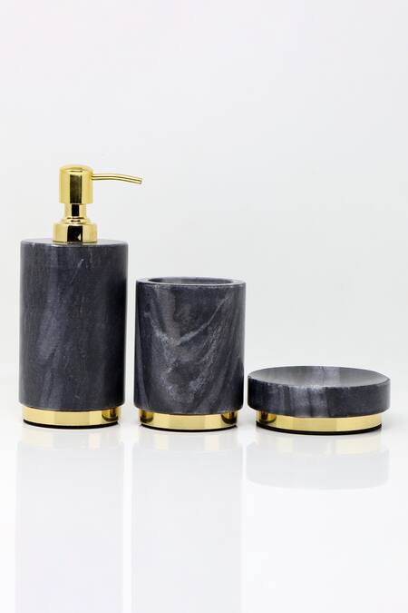Black, gold soap dish, dispenser & brush stand in marble base with matte finish.