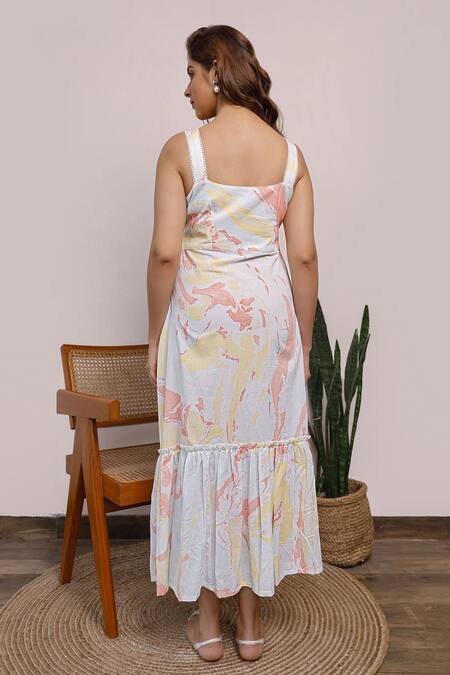 Light blue, yellow midi dress with marble print and ruffle at the hem.