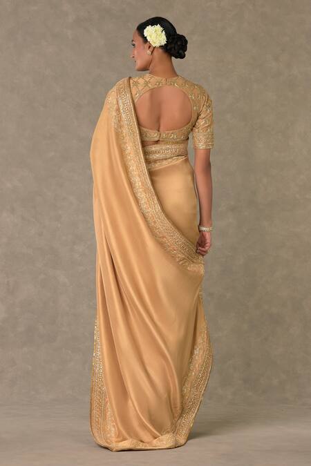 Beige saree adorned with madakal-chidiya border in pita, dori, sitara & dabka kaam embroidery. Comes with embroidered blouse with jaal, chidiya motif in pita, dori, sitara and dabka kaam. Paired with masakali print dupatta embellished with borders and edged with kinari.