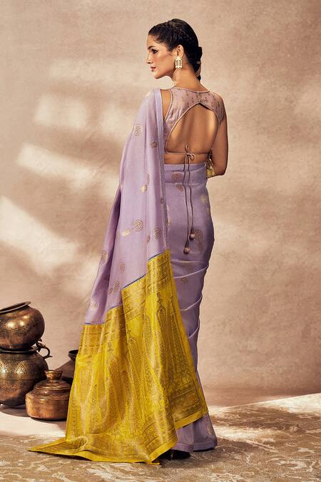 Lilac saree crafted in jacquard silk featuring pixie dust embroidery all over. Paired with a foil printed unstitched blouse piece made of tissue.
