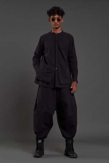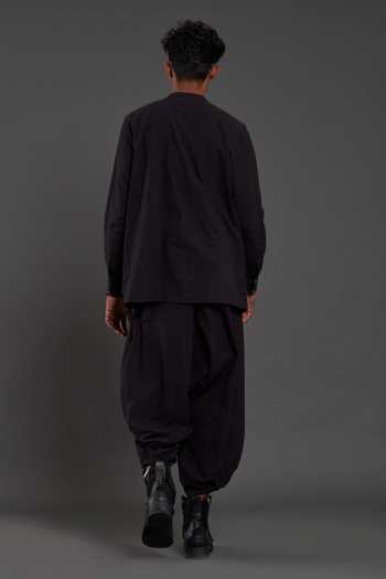 Black shirt in cotton fabric base & band collared neckline. Paired with baggy pant.
