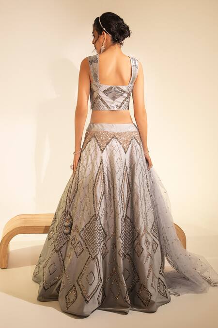Grey lehenga featuring all over geometric jewels sequin embroidery. Paired with a sleeveless padded blouse and scallop hem dupatta with sequinned borders.